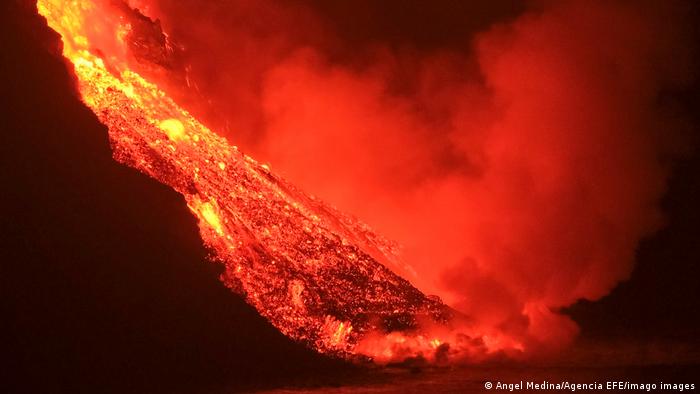 Die orangen glühende lava ergießt sich auf der spanischen kanareninsel la palma über die klippen ins meer la palma. La palma is a stratovolcano, and is the largest of the western canary islands.